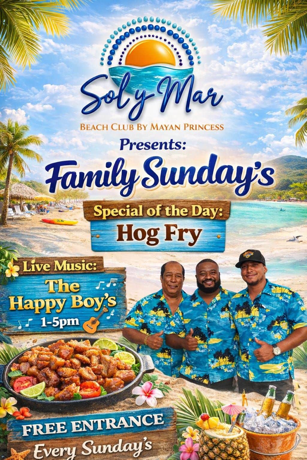 The Happy Boys Island Music @ Sol y Mar Beach Club every Thursday on Cruise Ship Days and every Sunday for Family Beach Day